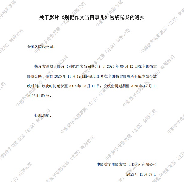 《别把作文当回事》密钥延期及调整影片票房结算标准的通知