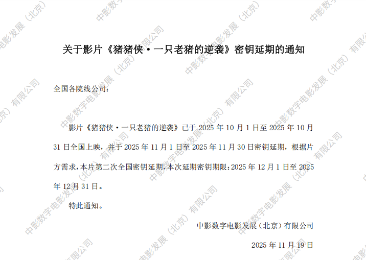《猪猪侠·一只老猪的逆袭》第三次密钥延期及变更范围的通知