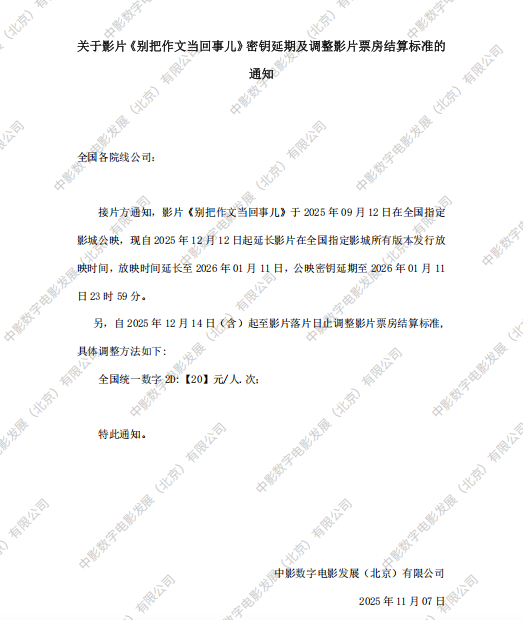 发行通知 » 《别把作文当回事》密钥延期及调整影片票房结算标准的通知
