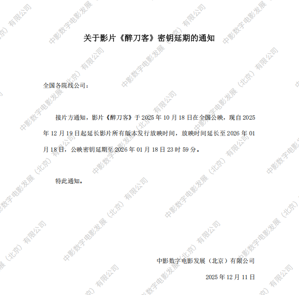 《醉刀客》密钥延期的通知