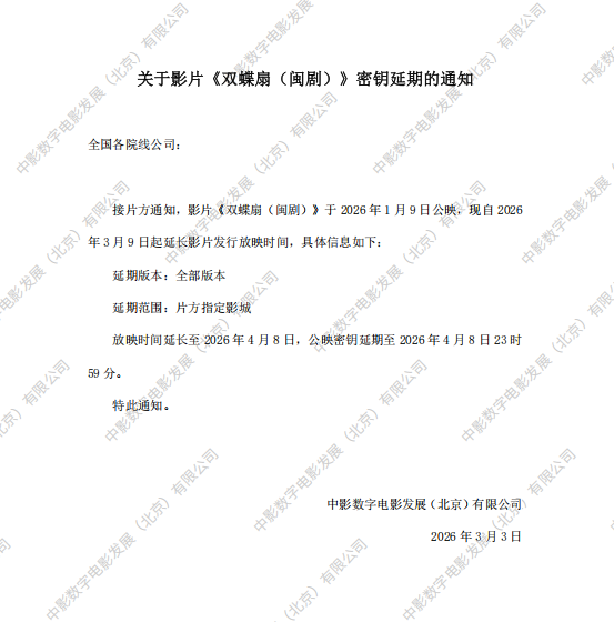 《双蝶扇(闽剧)》密钥延期的通知