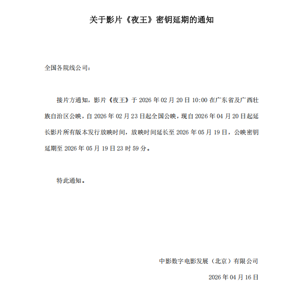 关于影片《夜王》密钥延期的通知