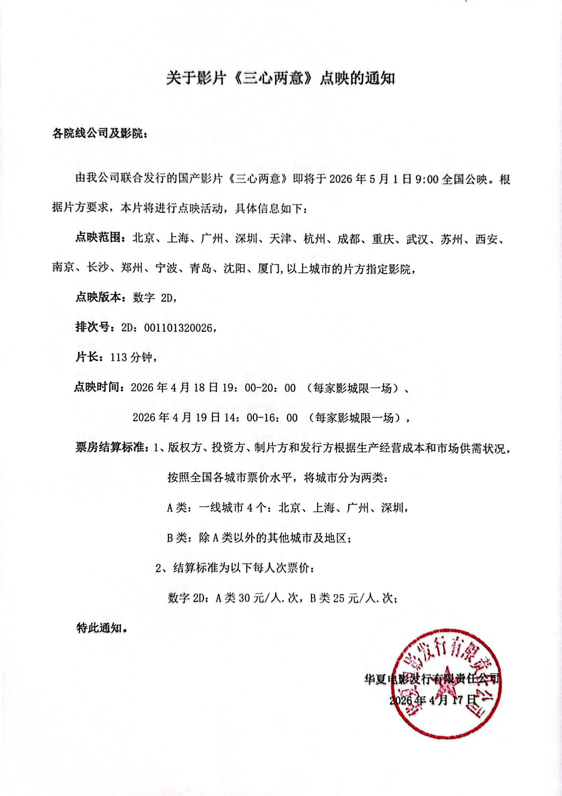 发行通知 » 《三心两意》点映的通知
